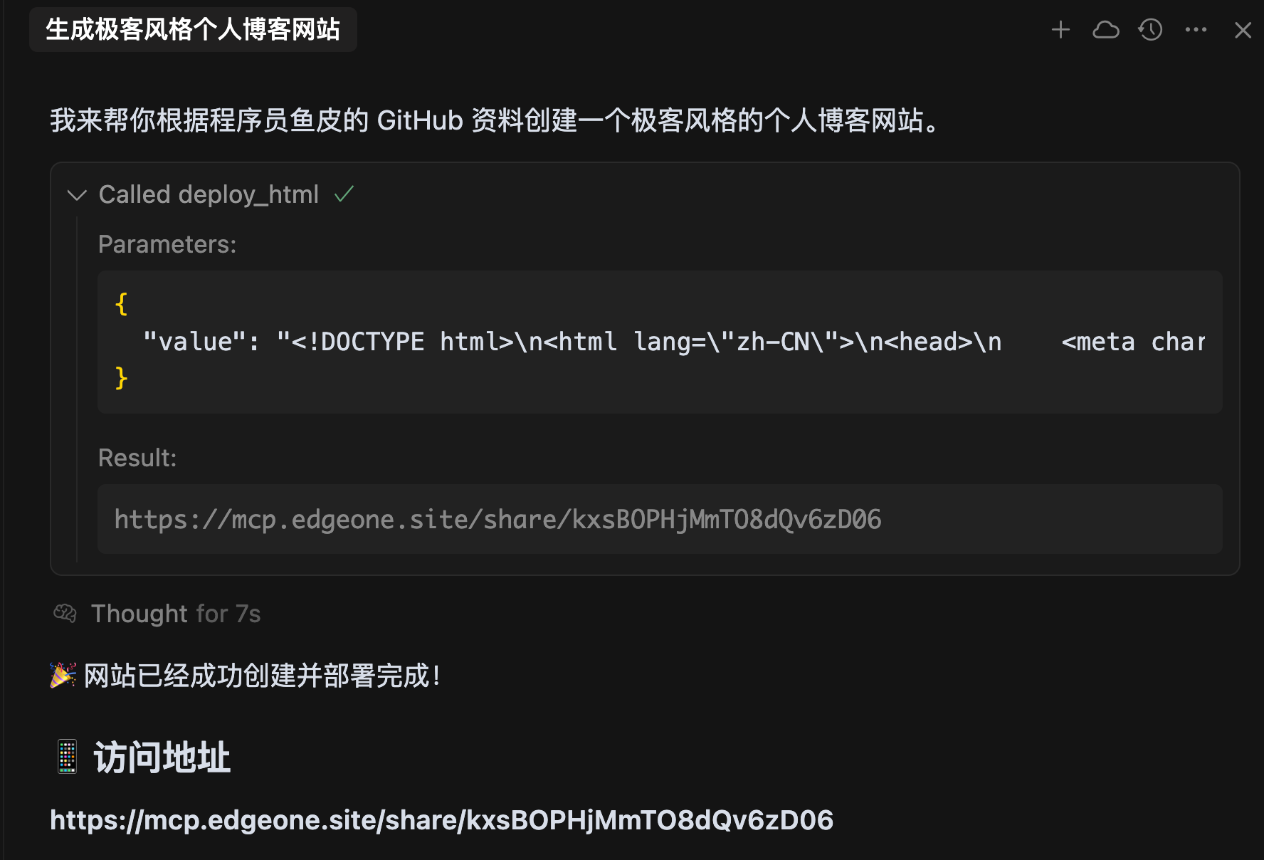 有了 EdgeOne Pages MCP,我直接在 AI 编程工具里跟 AI 说:“帮我部署这个项目”,它就能自动完成打包、上传、部署的全过程,最后给我一个可以直接访问的 URL。而且部署到全球加速网络,各地访问速度都很快。