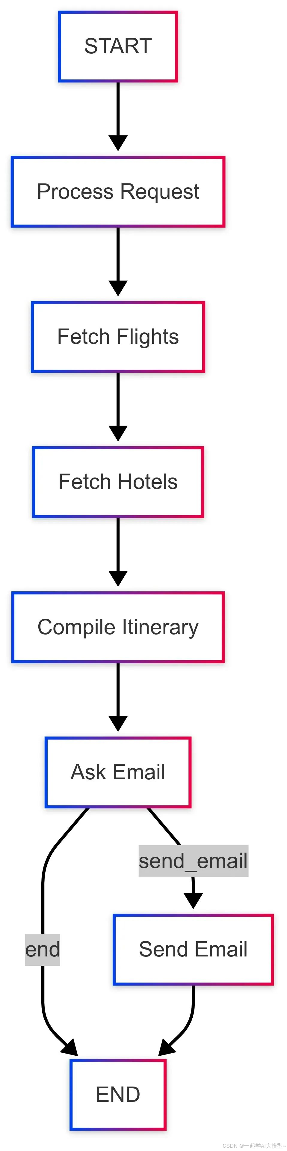 咱们来看个实际例子:一个旅行规划助手,帮用户规划行程,实时获取航班和酒店信息,展示在网页上,还能根据用户需求通过邮件发送行程。这是个很适合用 LangGraph 的场景,因为它涉及: