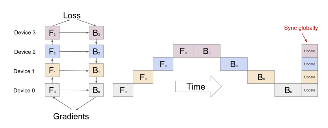 如图39中Gpipe流程所示,因为要在本batch结束后同步梯度信息以保证全局的Gradient统一的,虽然1个batch中F0和B0被拆成了4个微批(F0,0、F0,1、F0,2、F0,3)和(B0,3、 B0,2、 B0,1、 B0,0),但是每个Device至少有6个time stage在等待,占总时间14 stage的42%,较纯Model parallelism有所改善,但是利用效率仍然不算高。