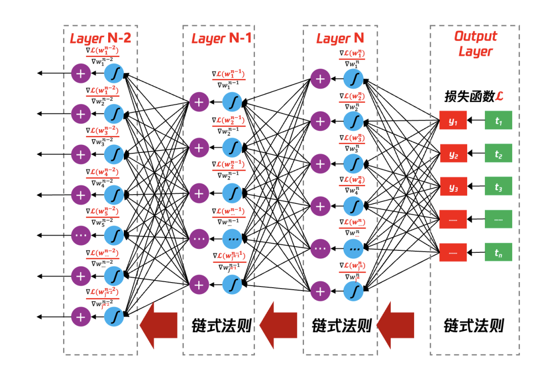 1、生成预测与预期比较:模型生成的预测token归一化后(normalize)有概率标识,那么概率高的会被选中,但是选中的token并不是期望的,此时会存在生成值与预期值的loss。 2、反向传播:因为预测值(output)与预期值(expect)有loss,所以需要借助于反向传播算法从最后一层往第一层反向传播,核心是基于链式法则进行梯度下降,通过调整下降的梯度(斜率)和学习率来起到逐步收敛的目的。 3、更新参数:1次FW、1次BW,就会完成一次权重参数的更新,这样的过程要进行数万轮知道随机输入、随机产出的与预期值的偏差基本收敛。