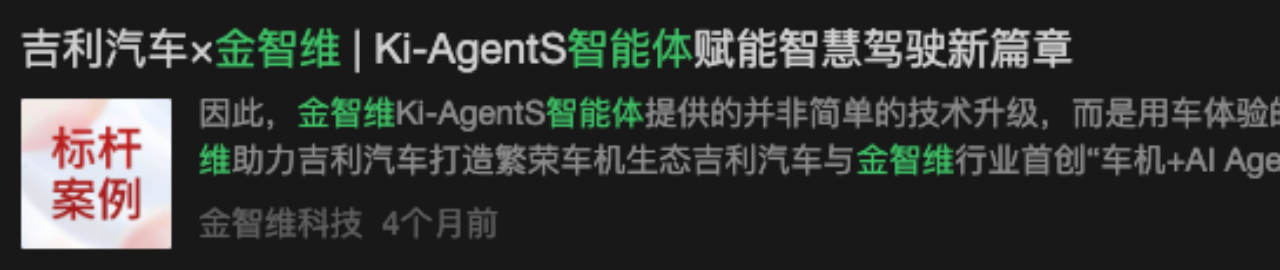 吉利汽车与金智维行业首创“车机+AI Agent”的语音交互服务模式,通过构建“通用能力+定制化开发”的解决方案,突破传统车机语音助手局限,赋能车机系统实现对第三方APP的深度操控。吉利银河A7用户无需多次手动点击,仅通过语音即可随心控制智能家居场景及设备。目前,Ki-AgentS已支持多个会议、智家APP,覆盖用户日常工作、生活的高频场景,金智维还将持续针对各类车型的平台应用进行开发适配,进一步拓宽吉利汽车“车—人—路”的全方位智能生态的边界,为车机生态的繁荣带来更多新的可能性。