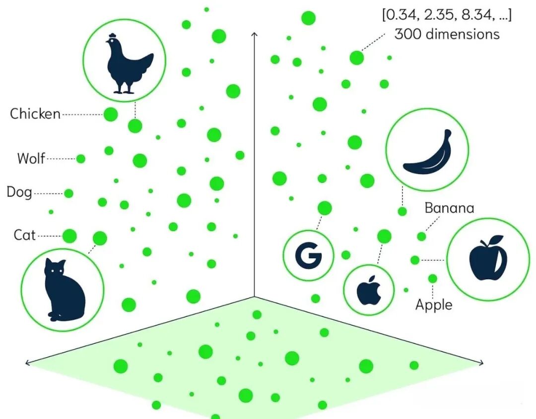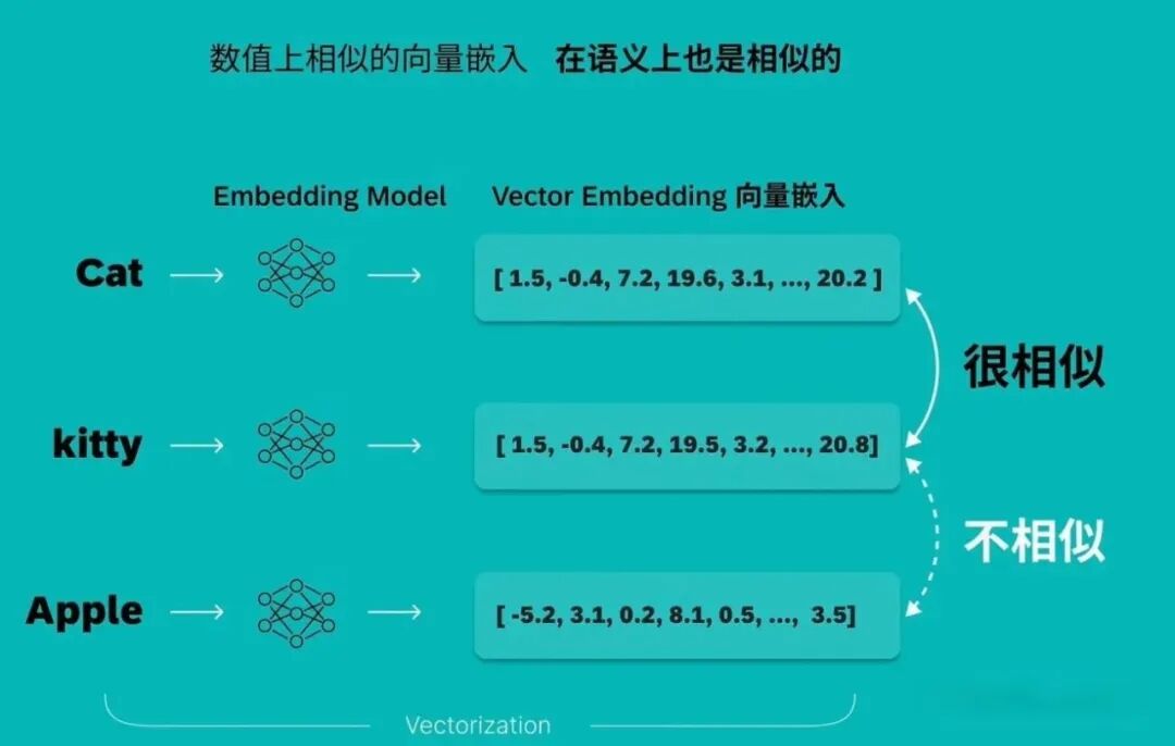 向量嵌入(Vector Embeddings):将复杂数据(如:图像、文本、音频等)转换为数值向量的过程和结果。向量通常是高维的数字数组,向量中可以体现数据间的语义信息,语义相近的数据向量值接近,在向量空间中距离更近。