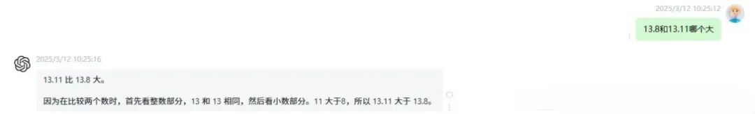 举个常见的例子:让大模型比较13.8和13.11哪个大,它可能会很自信地告诉你13.11更大。这种明显违背数学常识的回答,暴露了大模型在回答某些问题时,可能会存在一本正经胡说八道的情况。