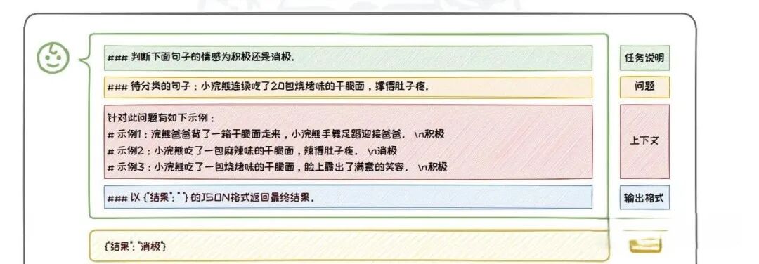 - • 上下文:向模型提供的任务相关背景信息,用以增强模型其对任务的理解以及提供解决任务的思路。如:特定的知识前提、目标受众的背景、相关任务的示例等。