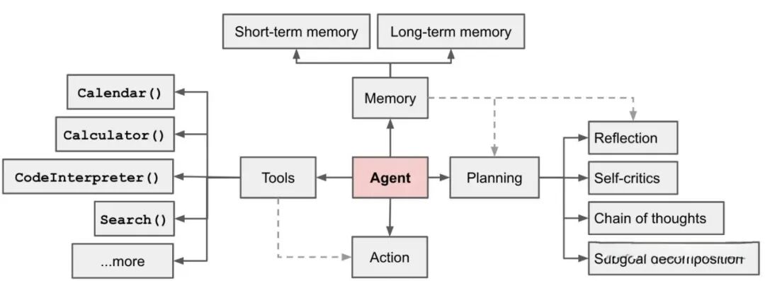 Agent = LLM(大模型)+ Planning(规划)+ Memory(记忆)+ Tools(工具)