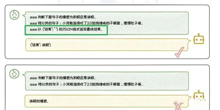 通过指定明确的输出格式,使模型的输出结构化,便于下游任务直接提取、使用生成内容。或者直接提供输出格式的具体示例,使模型按照期望的输出格式输出内容。