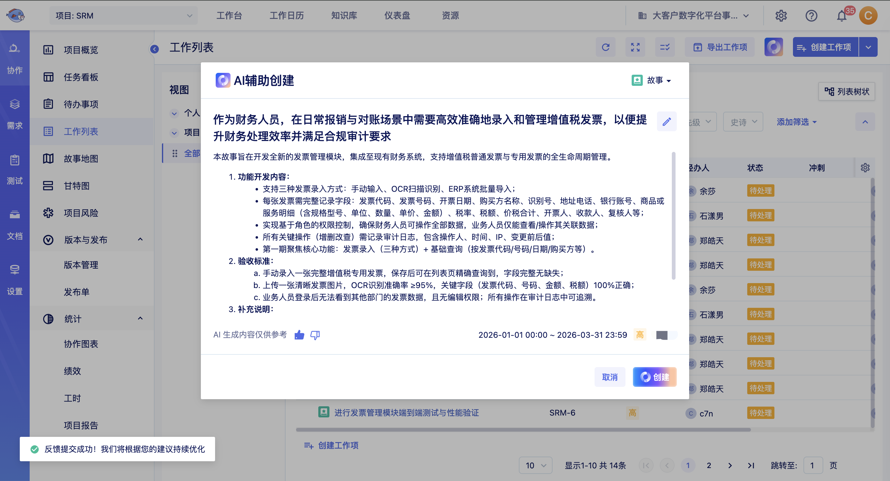 通过「AI辅助创建」与「智能任务拆解」,系统实现了需求录入的语义化解析与任务规划的结构化分解,有效降低了事务性工作的冗余度;