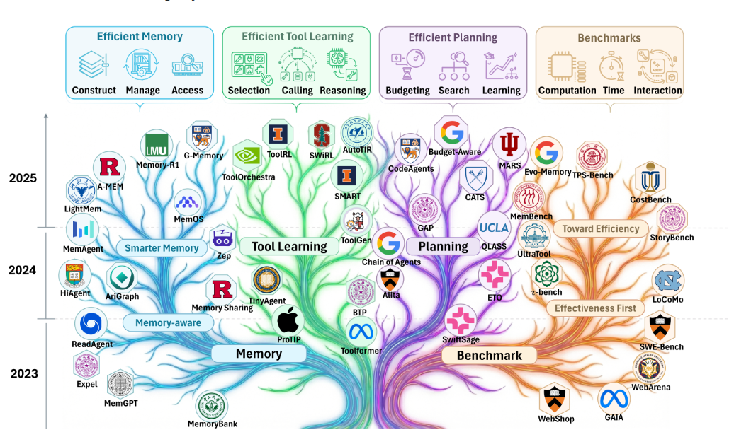 这张图以一棵“成长树”的形式展示了从 2023 到 2025 年 高效智能体的研究趋势,分为四大核心方向: