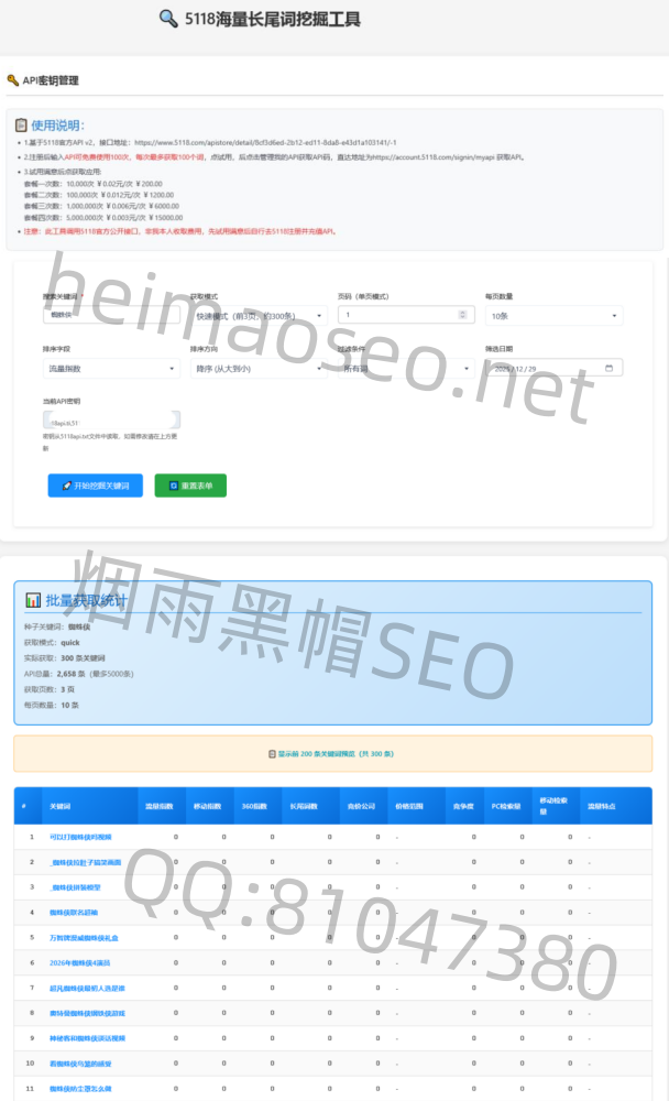 **烟雨黑帽SEO站群**将5118关键词工具包完全集成到核心系统中: