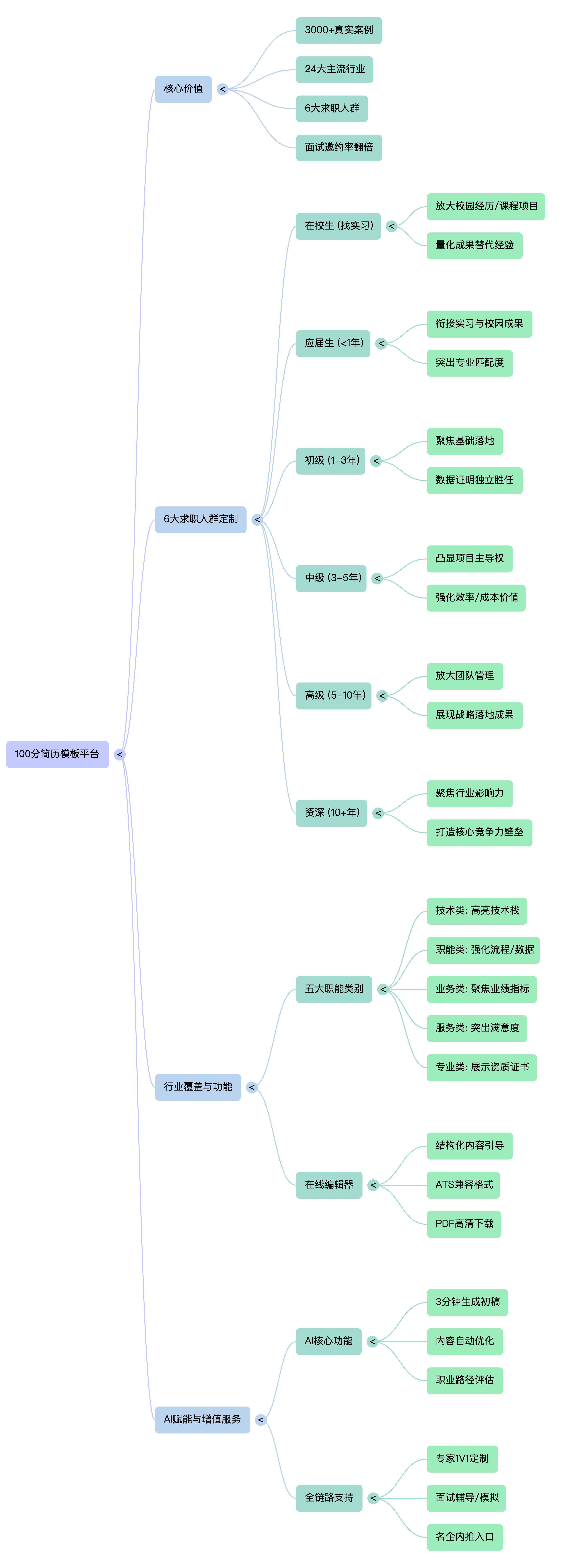求职的本质,是让HR在30秒内看到你的“价值匹配度”。100分简历用3000+行业专属模板、6大人群精准适配,打破“模板通用化”痛点;用零门槛编辑、AI赋能、全链路服务,解决“不会写、写不好”的难题。无论你是想找实习的在校生,还是冲击高端岗位的资深从业者,在这里都能找到专属简历解决方案,在线编辑、PDF秒下载,让简历成为求职路上的“加分项”,帮你快速斩获心仪offer!