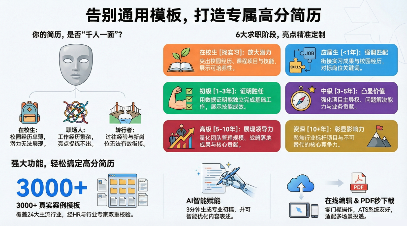 3000+真实案例覆盖 24 大行业 6 大求职人群专属简历模板(在线编辑 + PDF 下载)