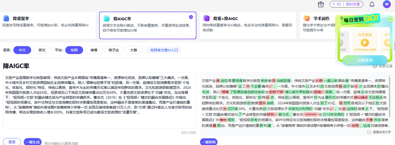 听名字就知道这是一款比较接地气的国产工具,专门解决国内学生论文降aigc的痛点。