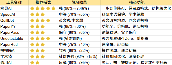 为了方便大家做决策,我把这10款降ai率工具的核心特点整理成了下面这张表: