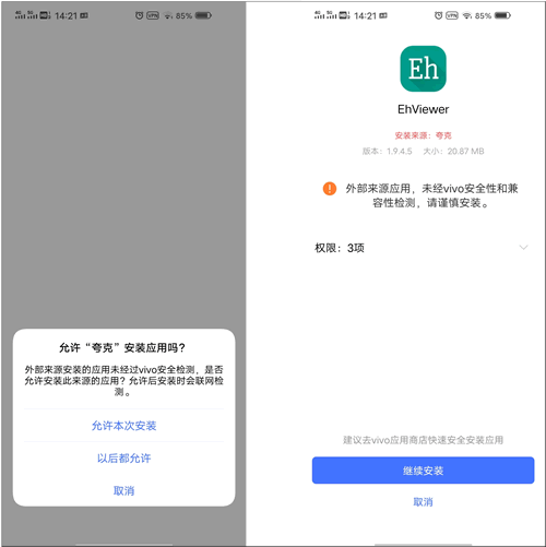 - 弹权限→选「允许本次安装」→点「继续安装」;
