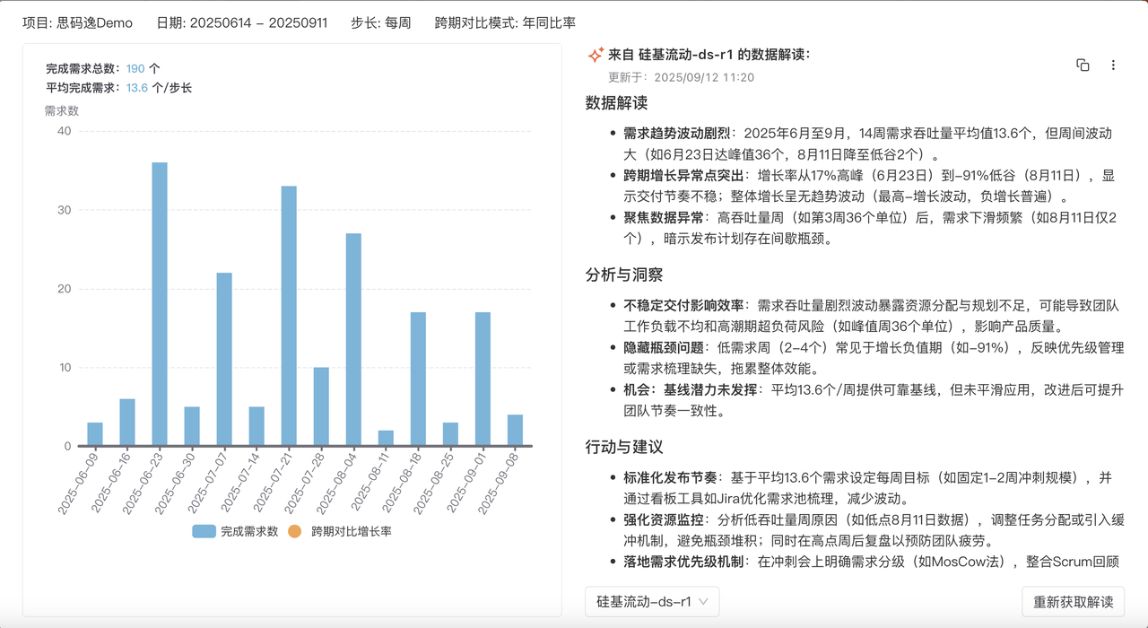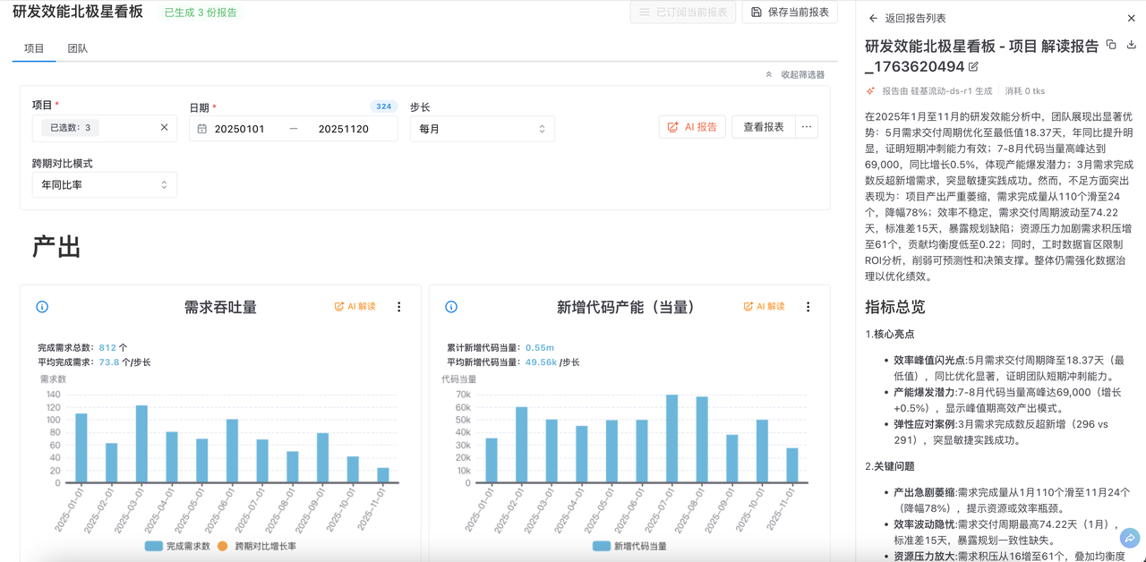 在多图表的分析场景下:遵循“先总后分”的汇报逻辑。先看整体叙事(如“本季度效能核心矛盾是‘快而不稳’”),再下钻优势和问题背后的原因(如“A项目快是因颗粒度细,但缺陷增多因测试资源不足”),最后按“事实-原因-影响”输出结构化结论,直接对标汇报需求。