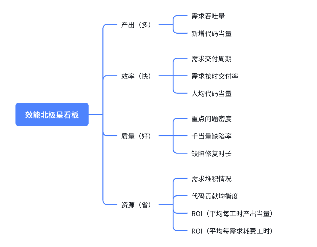 看板的本质是多图表的逻辑化组合,通过数据间的关联关系构建“叙事链”,让效能表现从零散指标升级为可追溯、可解释的系统认知。但想从图表中精准获取有效信息,形成科学的效能分析结论,则需对「指标逻辑」和「维度关联」有深度理解——这对团队的数据解读能力提出了更大的挑战。例如我们使用“多快好省”原则定义出来的效能北极星看板: