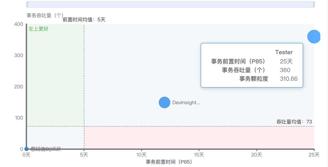 横轴是“事务交付前置时间的P85”(85%事务完成的最长时间,反映多数需求的极限周期)