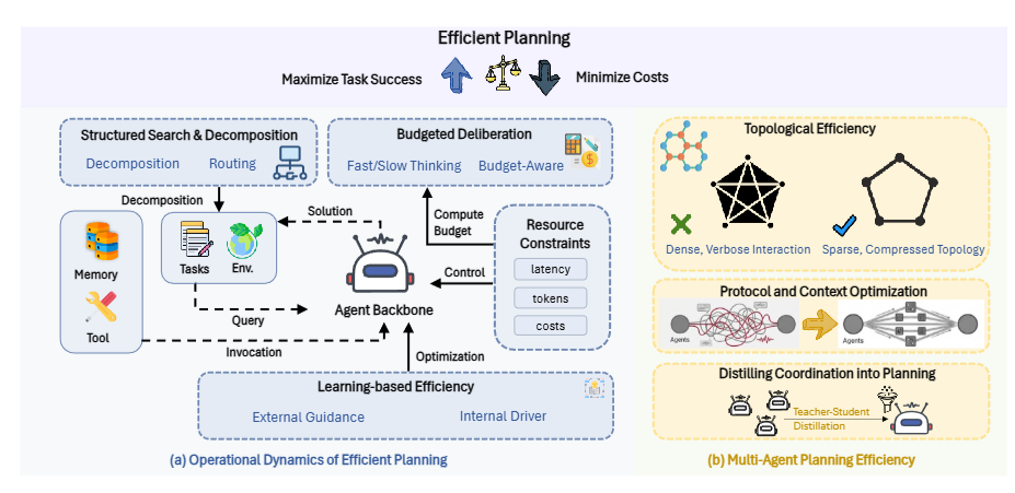 规划是智能体的"决策大脑"。传统规划假设算力无限,但现实中必须在严格的延迟、token和通信预算下做决策。论文将规划效率分为单智能体和多智能体两大类。