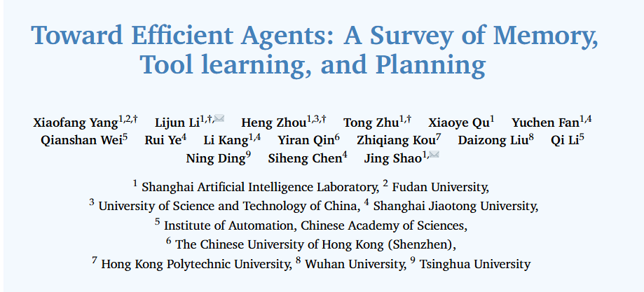 来自上海人工智能实验室等多家机构的研究团队,在2026年1月发布了一篇系统性综述论文,首次从效率这个关键维度,全面梳理了智能体领域的研究进展。论文明确提出:高效的智能体不是简单地用更小的模型,而是要在保证任务成功率的前提下,最大限度降低资源消耗。
