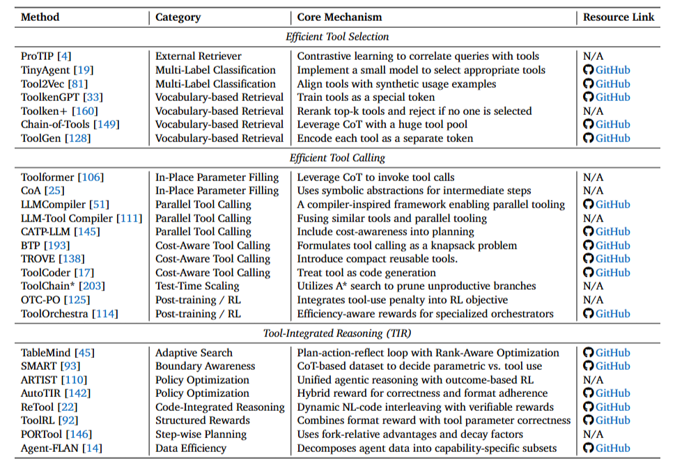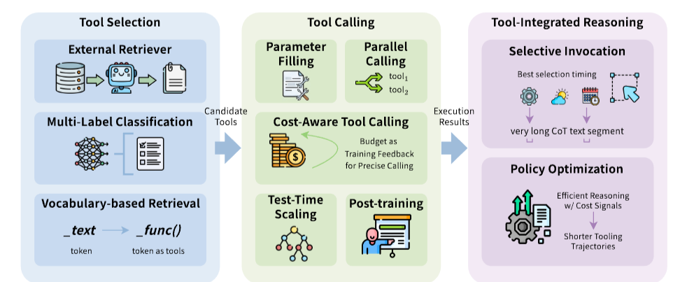 后训练优化让模型主动学会"少调用"。OTC-PO在强化学习目标中加入工具使用惩罚;ToolOrchestra训练专用编排器,用效率感知奖励;ToolRM用结果奖励模型引导高效轨迹。