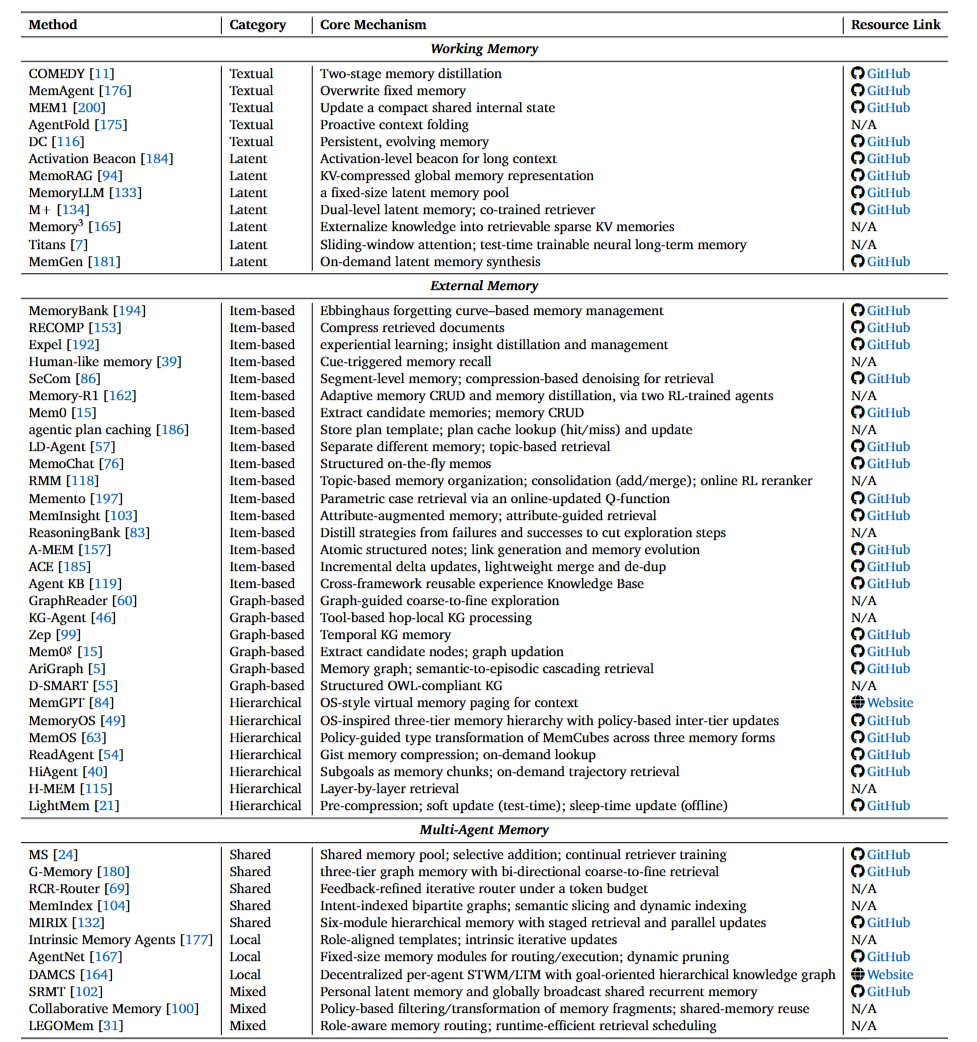 - 分层记忆: MemGPT模仿操作系统的虚拟内存,MemoryOS设计三层存储(短期/中期/长期),HiAgent用子目标作为索引
