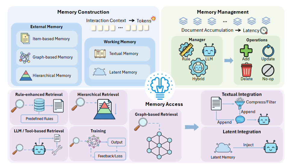 - 分层检索: H-MEM用多层索引递归查找;MemoryOS在短/中/长期存储中分别检索