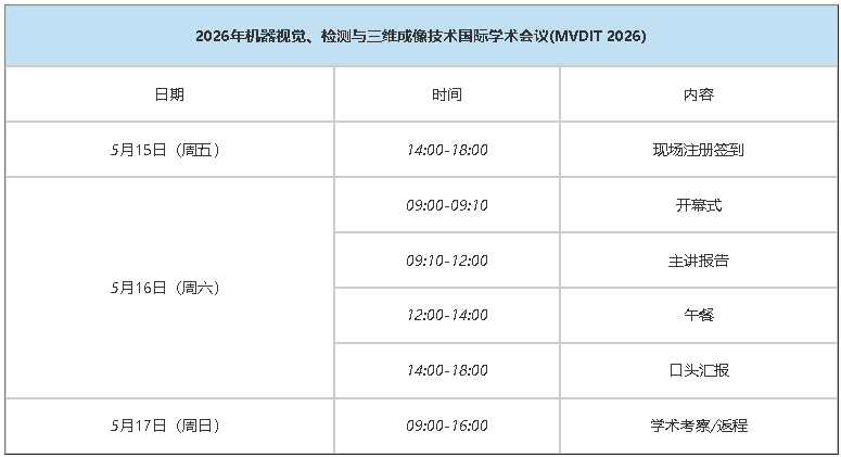 由南昌航空大学主办,南昌航空大学仪器科学与光电工程学院承办的2026年机器视觉、检测与三维成像技术国际学术会议(MVDIT 2026)将于2026年5月15日至17日在中国南昌召开。