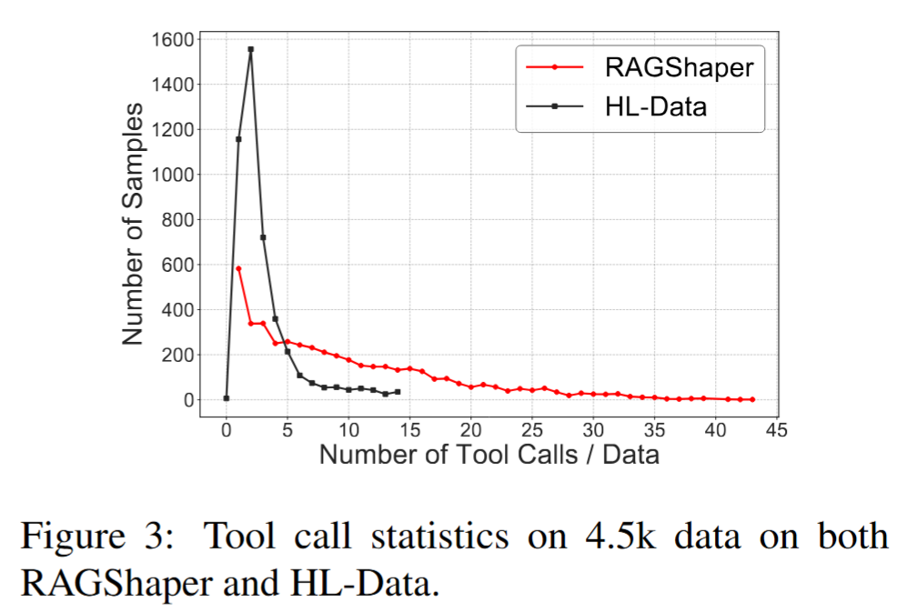 - • RAGShaper 呈长尾分布,大量轨迹需要10-40+步