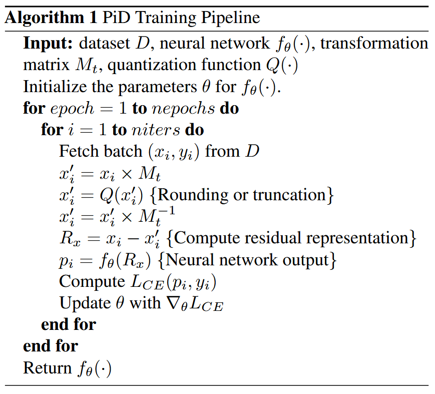 - 算法接收训练数据集D 、神经网络fθ (·)、变换矩阵Mt和量化函数Q(·),并初始化神经网络的参数θ。