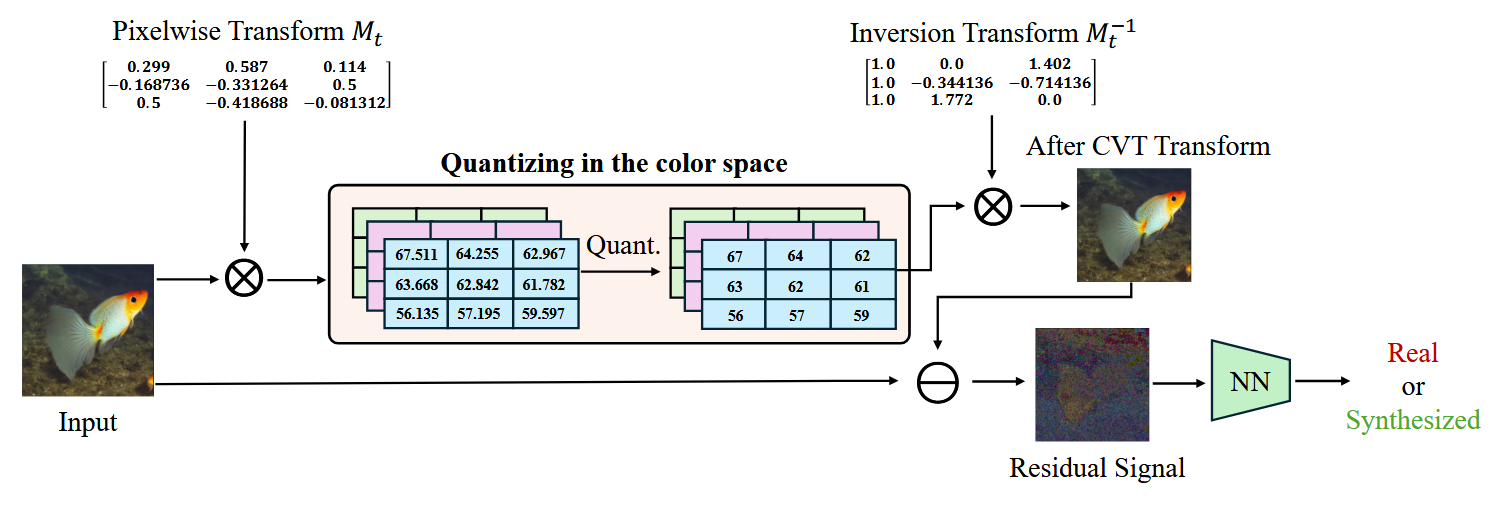 其中X1是张量-矩阵的模式-1乘积运算。【这个就代表颜色转换了】 - 检测:训练一个神经网络不看原图,而是专门看这个残差图,来学习分辨真假。