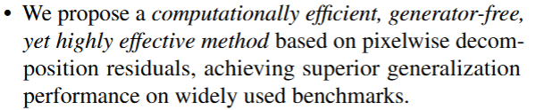 提出了一种计算高效、无需生成器且高效的方法:作者团队提出了一种基于像素级分解残差的新检测方法。该方法不依赖于任何生成模型进行图像重建,从而避免了相关计算开销和模型偏差,同时在广泛使用的基准测试上实现了卓越的泛化性能 。