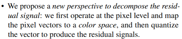 提出了一种分解残差信号的新视角:该方法的核心创新在于分解残差信号的思路。具体而言,它首先在像素级别进行操作,将像素向量映射到另一个色彩空间(如YUV),然后对该向量进行量化以产生用于检测的残差信号 。