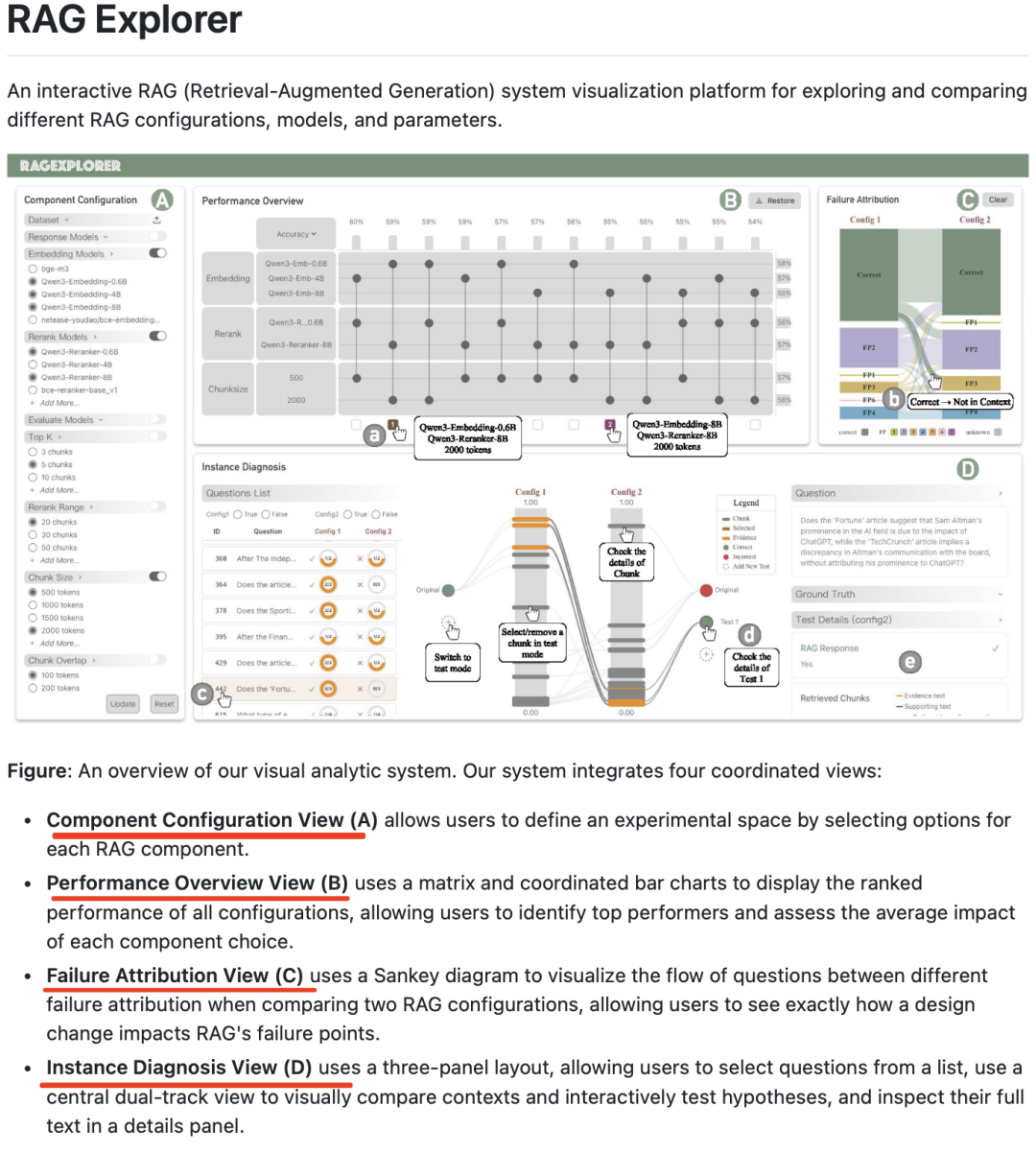 先看一个工作,RAGExplorer,RAG系统比较诊断设计的可视化分析系统,通过组件配置视图、性能概览视图、故障归因视图和实例诊断视图四个视图做分析,用于帮助用户探索和对比不同的 RAG 配置、模型及参数,为 RAG 系统的评估与优化提供直观支持,属于面向研究场景的工具。《RAGExplorer: A Visual Analytics System for the Comparative Diagnosis of RAG Systems》,https://arxiv.org/pdf/2601.12991,https://github.com/Thymezzz/RAGExplorer