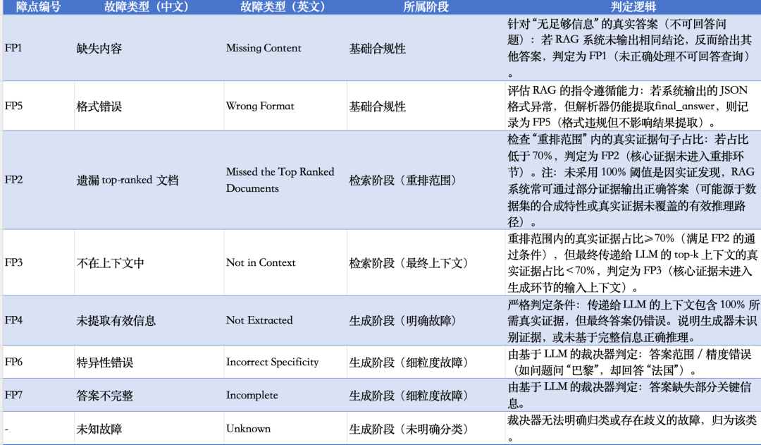 其核心目的还是说,通过标准化、自动化的分层检查,定位RAG系统失效的关键环节(是不可回答问题处理不当、检索漏证、生成推理错误,还是格式违规),为后续优化提供明确方向(如FP2需优化重排模型,FP4需优化生成器的证据识别能力)。
