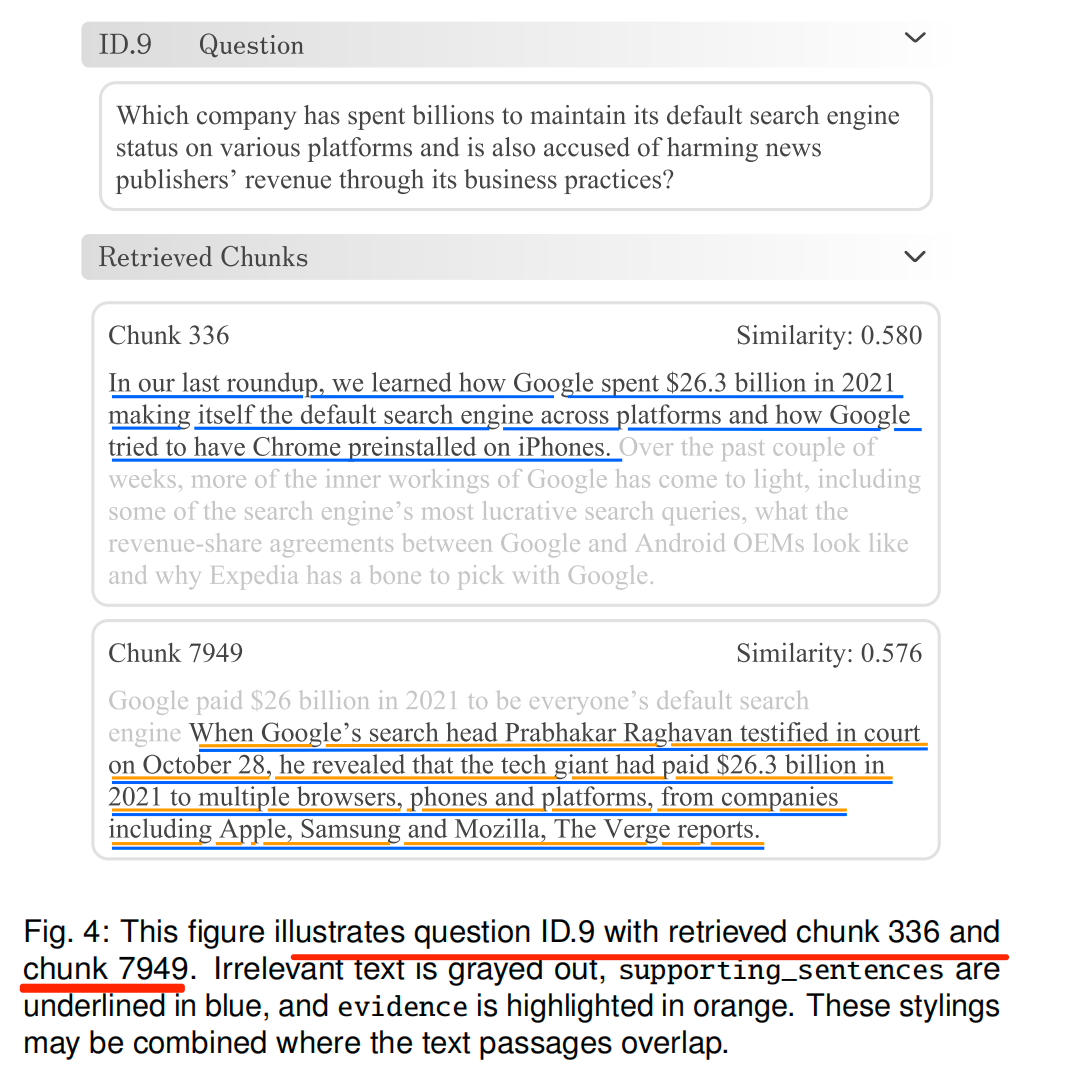 问题ID.9及其检索到的336号文本块与7949号文本块。无关文本以灰色显示,支持句以蓝色下划线标注,证据以橙色高亮显示。若文本段落存在重叠,这些样式可叠加呈现。