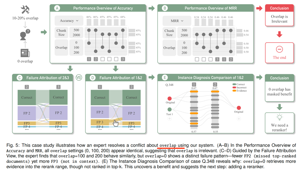 (C–D)在故障归因视图(FailureAttributionView)的指引下,专家发现重叠度=100和200的表现相近,但重叠度=0呈现出明显不同的故障模式——FP2(遗漏top-k排名文档)更少,但FP3(不在上下文中)更多。