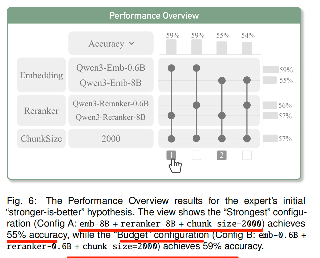 如上图所示:“最强配置”(配置A:80亿参数嵌入模型+80亿参数重排模型+分块大小=2000)的准确率为55%,而“经济型配置”(配置B:0.6亿参数嵌入模型+0.6亿参数重排模型+分块大小=2000)的准确率达59%。