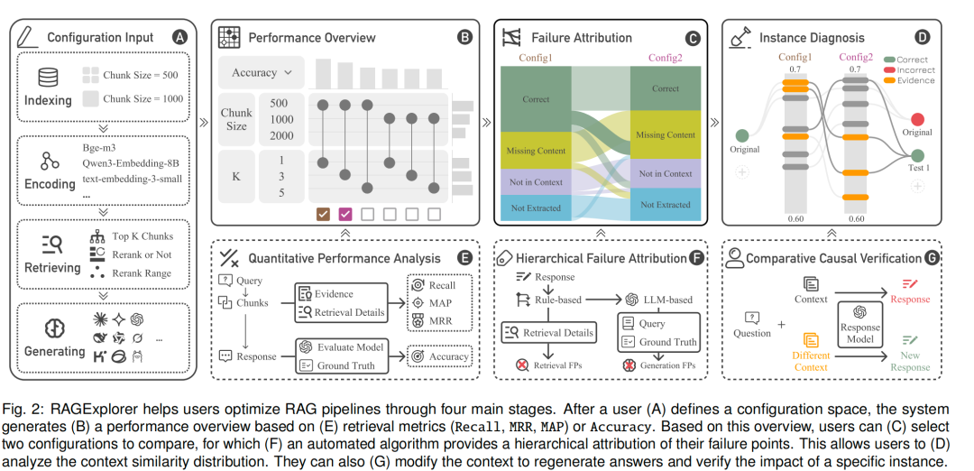 通过四个主要阶段帮助用户优化RAG流水线。用户(A)定义配置空间后,系统会基于(E)检索指标(召回率Recall、平均倒数排名MRR、平均精度均值MAP)或准确率(Accuracy)生成(B)性能总览。基于该总览,用户可(C)选择两个配置进行对比,系统会通过(F)自动化算法对这两个配置的故障点进行分层归因分析。借此,用户能够(D)分析上下文相似度分布,还可(G)修改上下文以重新生成答案,验证特定实例的影响。