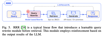 一个典型的线性模型是RRR(Rewrite-Retrieve-Read)模型如下图所示,在预处理阶段增加了一个“重写器”,增强了传统RAG的效果。