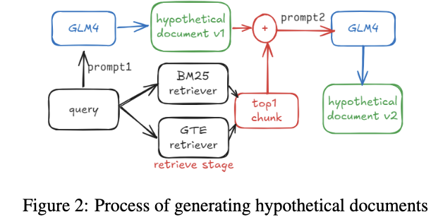 - HyDE生成虚构文档,为了减少大模型幻觉带来的干扰,使用BM25和稠密检索找到最相关的Top1文档作为上下文提示,来生成更准确的虚构文档。