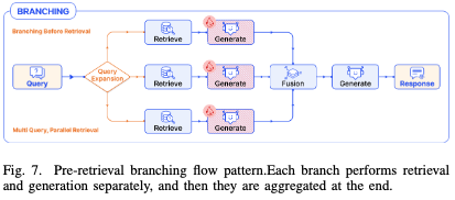 - 检索后分支(Post-retrieval Branching):检索后生成多个文档,并将多文档融合成一个最终的答案。