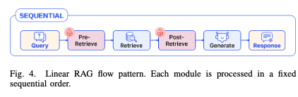 线性模式的一个通用框架如下图所示,是一个简单的“索引 (Indexing) -> 预检索处理 (Pre-retrieval) -> 检索 (Retrieval) -> 后检索处理 (Post-retrieval) -> 生成 (Generation)”步骤。