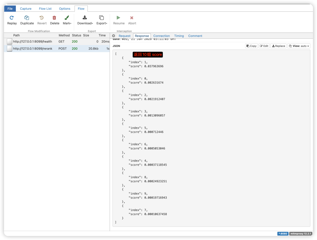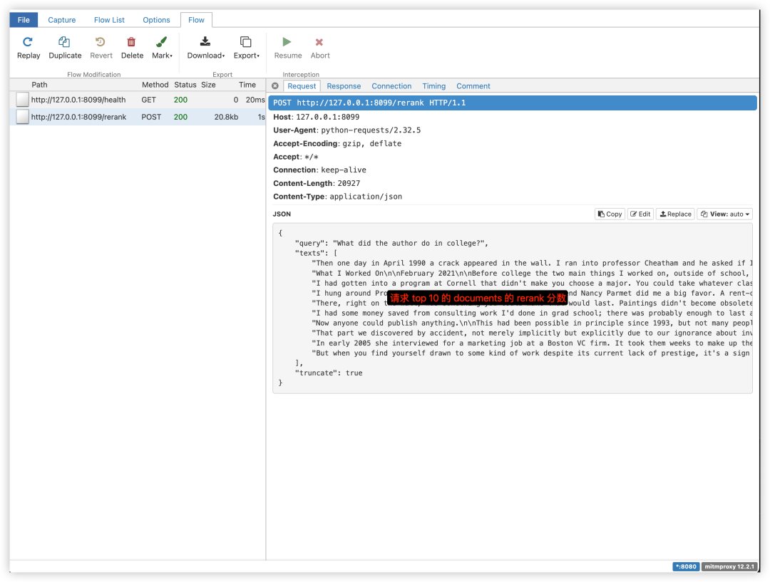 mitmproxy --mode reverse:http://127.0.0.1:8099 -p 9999, 通过 mitmproxy 可以方便查看 TEI 服务接收到的 api 请求 - 在 config.py 中设置 rerank api: