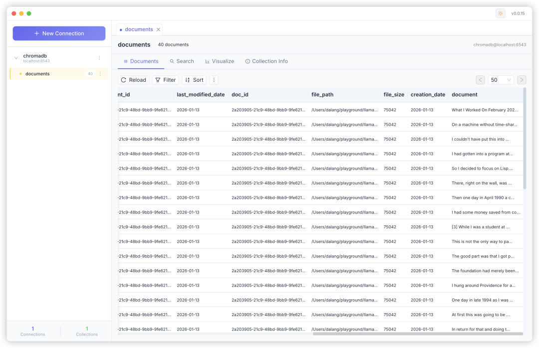 通过 VectorDBZ[7] 查看生成的 documents,每条记录对应一个向量数据。除了 vector 值和 document 文本内容,还会带其他元信息字段