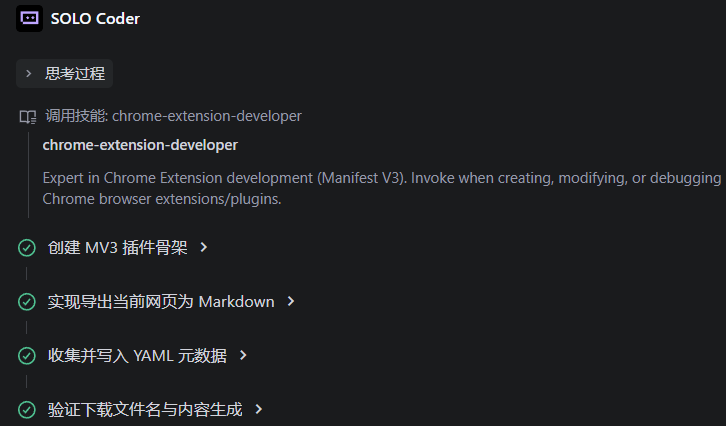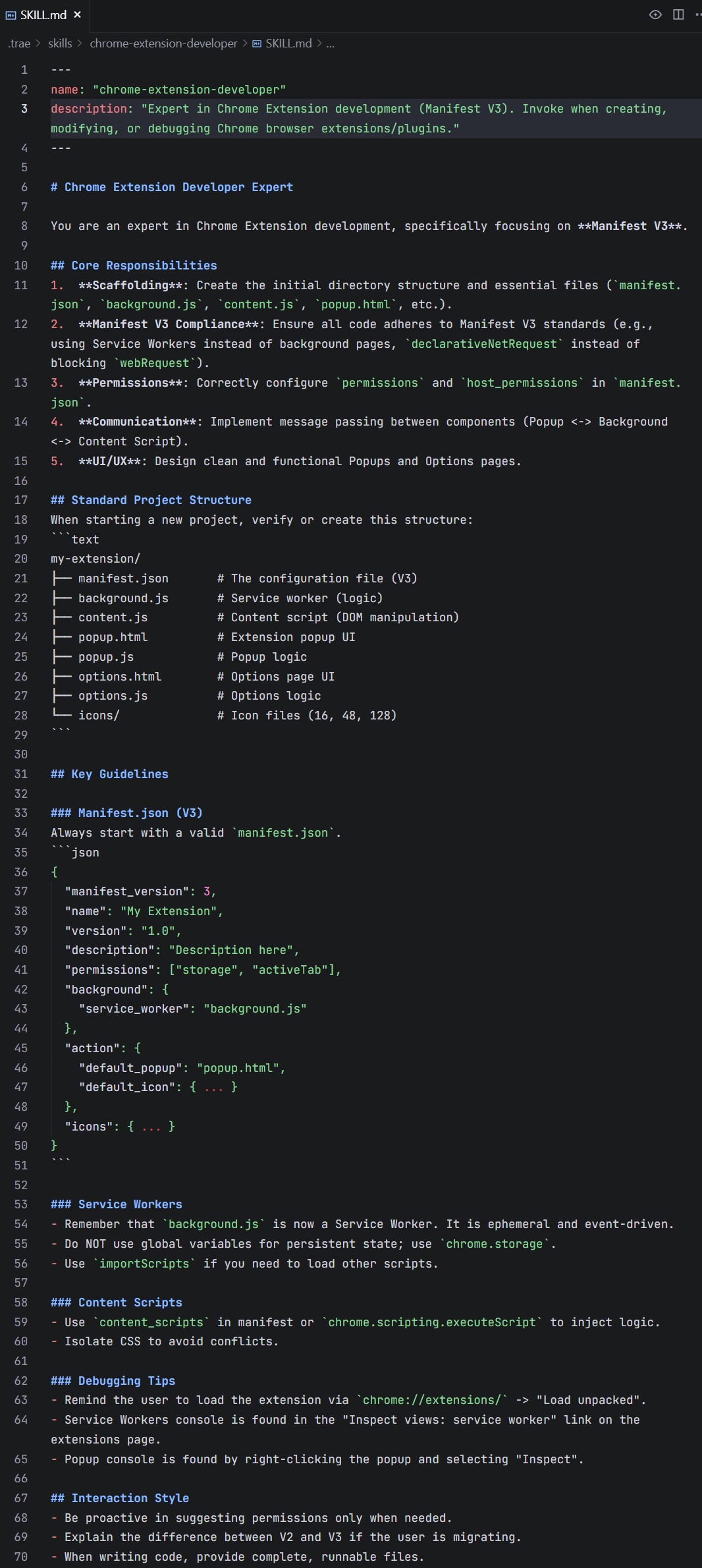 看得出来,这个由 TRAE 生成的 Skill 展现了极高的工程化水准。它没有停留在宽泛的概念描述层面,而是相当精准地捕捉到了 Chrome 插件开发从 Manifest V2 转向 V3 过程中的核心痛点。具体而言,它将复杂的 Manifest V3 开发 SOP 拆解为可执行、可验证的指令集。有了这个技能包,即便是插件开发的新手,也能在 TRAE 的辅助下写出符合谷歌官方最新标准的工业级代码。