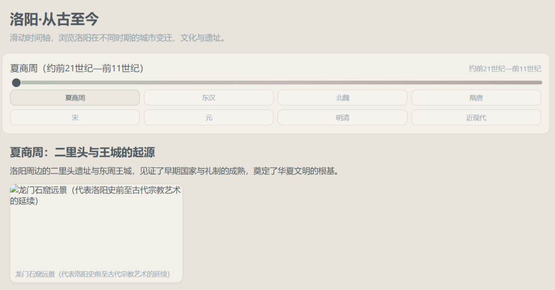 编写一个展示洛阳从古至今历史的动态网页,里面要有一个时间轴,让用户可以滑动选取时间,根据所选时间,下面的介绍部分也会随之变化,加入一些文物或遗址的照片增强说明。使用莫兰迪色系。开始任务前先使用 skill-finder 配置相关 Skill。