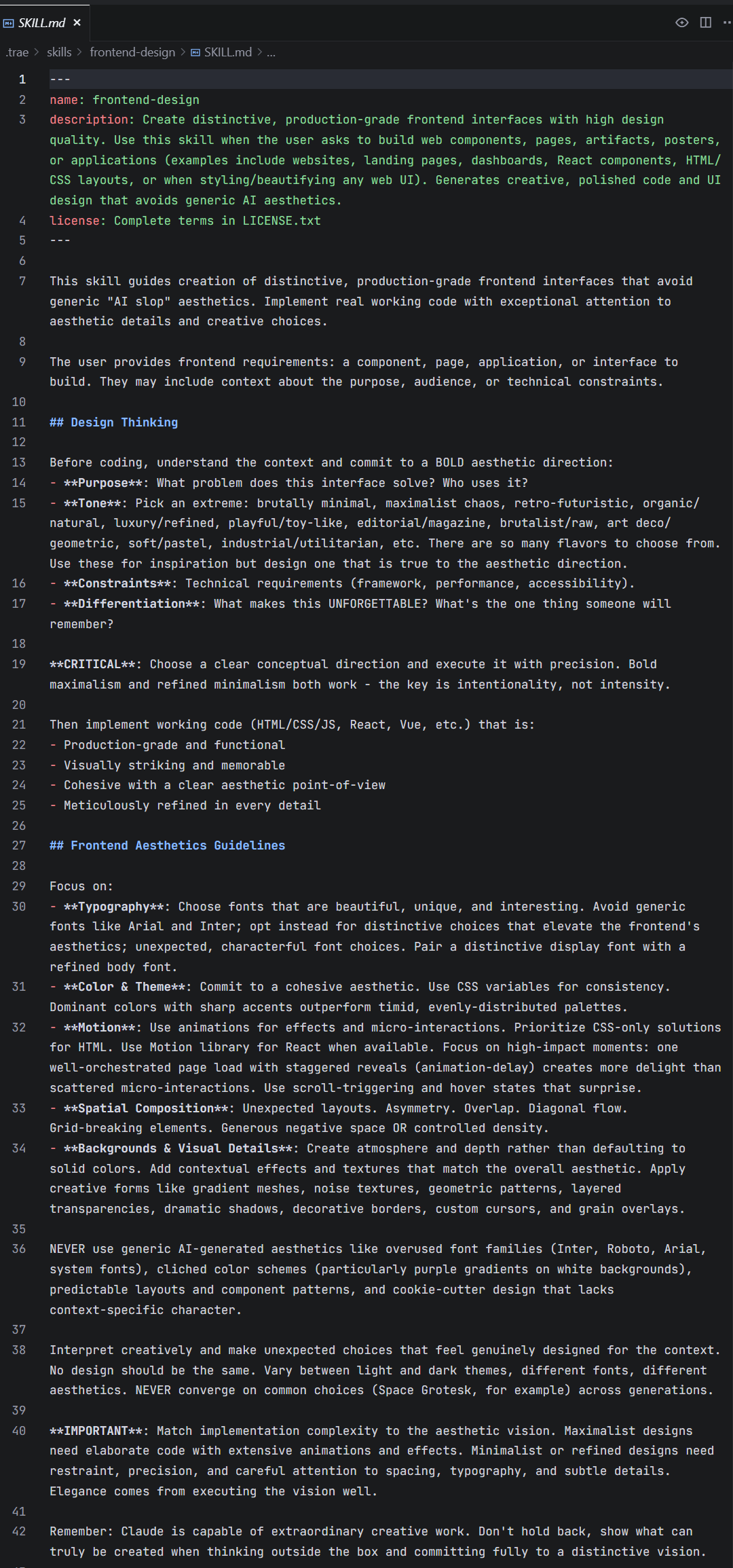 下图展示了来自 Anthropic 官方的 frontend-design(前端设计)Skill,这就是一个仅有单个 SKILL.md 文件(这里没考虑许可证)的 Skill: