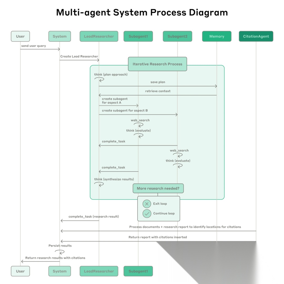 当用户提交查询时,主要智能体对其进行分析,制定策略,并生成子智能体以同时探索不同方面。如上图所示,子智能体充当智能过滤器,通过迭代使用搜索工具收集信息(在本例中是关于 2025 年的人工智能智能体公司),然后将公司列表返回给主要智能体,以便其编译最终答案。