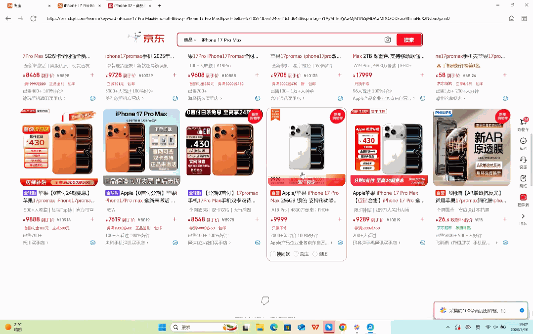 按照计划,第一步是去淘宝和京东抓取iPhone 17 PM的行情。