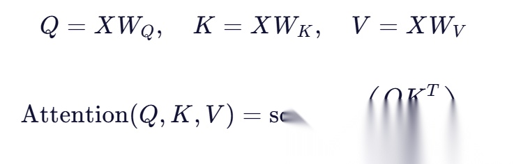 Scaled Dot-Product Attention是一种通过计算Query(Q)与Key(K)的缩放点积(因为需要除以K向量的维度dk的平方根,所以名叫Scaled)来衡量其相关性,并利用softmax归一化后的注意力权重矩阵,对Value(V)进行加权求和的注意力机制。Self-Attention则是该注意力机制的一种应用形式,其中Q、K和V均来自同一个输入序列X:首先将输入X分别通过可训练的权重矩阵(Wq、Wk、Wv)线性投影为Q、K、V,然后将其送入Scaled Dot-Product Attention进行计算。计算公式如下: